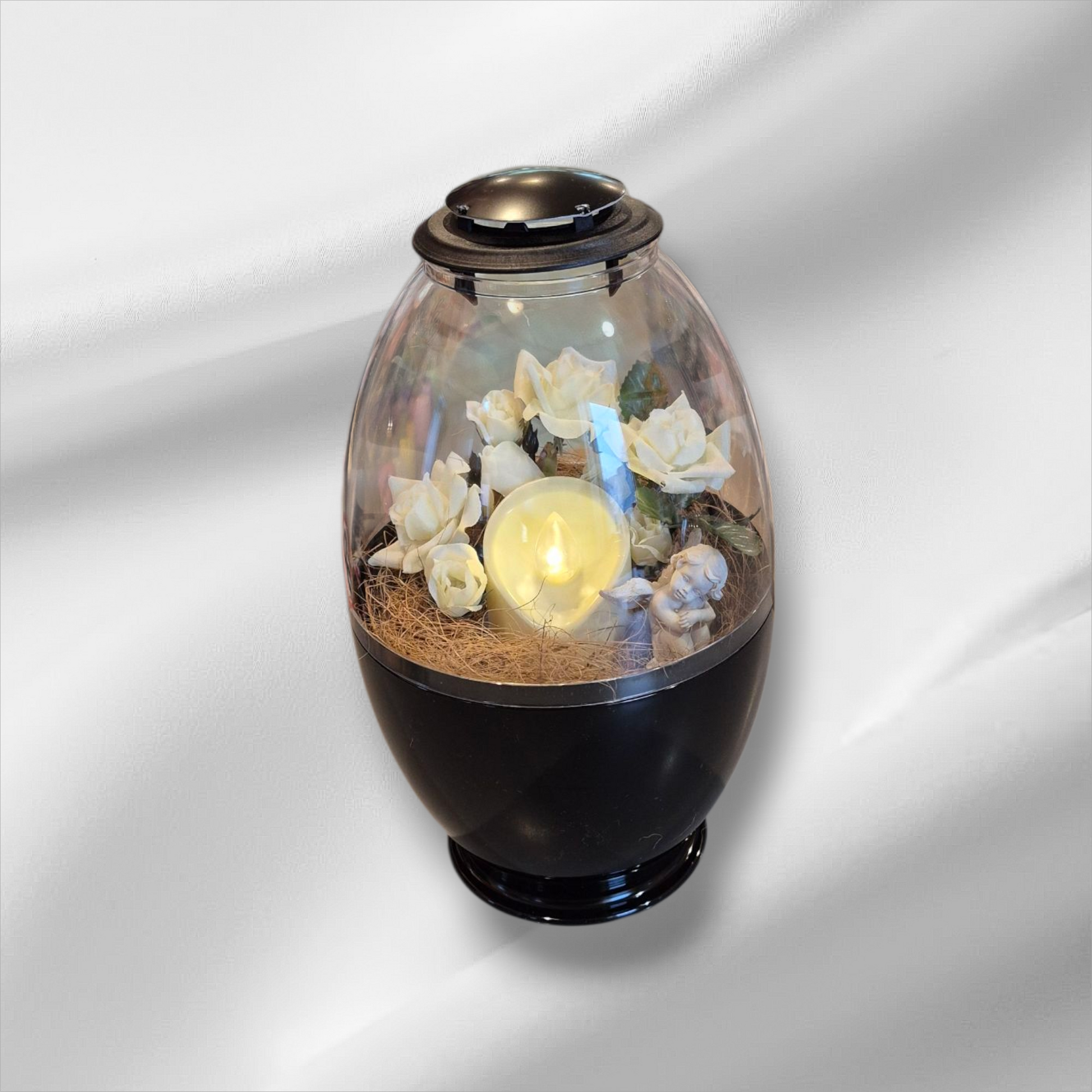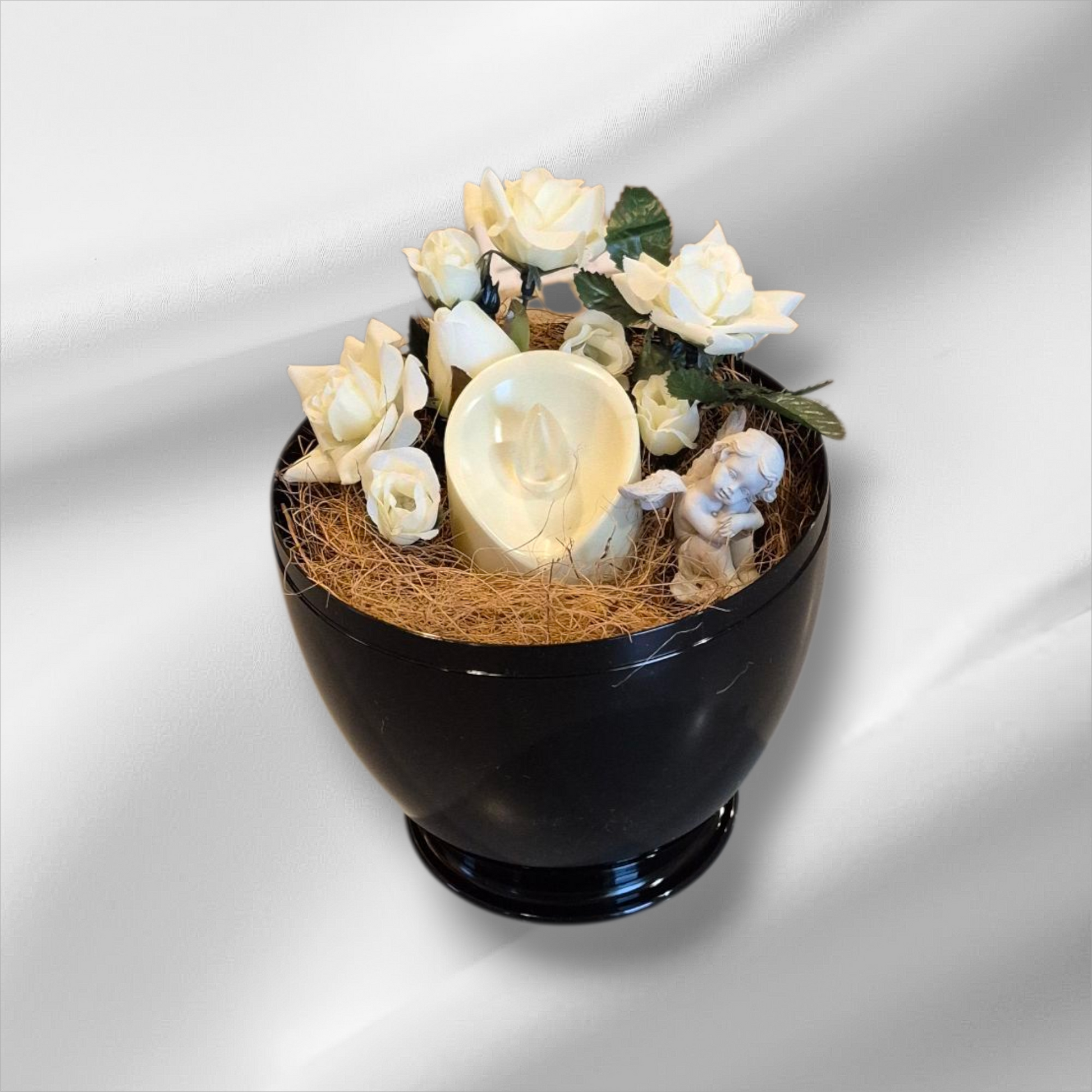 Elektronski nagrobni aranžma je izdelan iz svilnatega cvetja in vsebuje elektronski modul, ki sveti 1 leto.