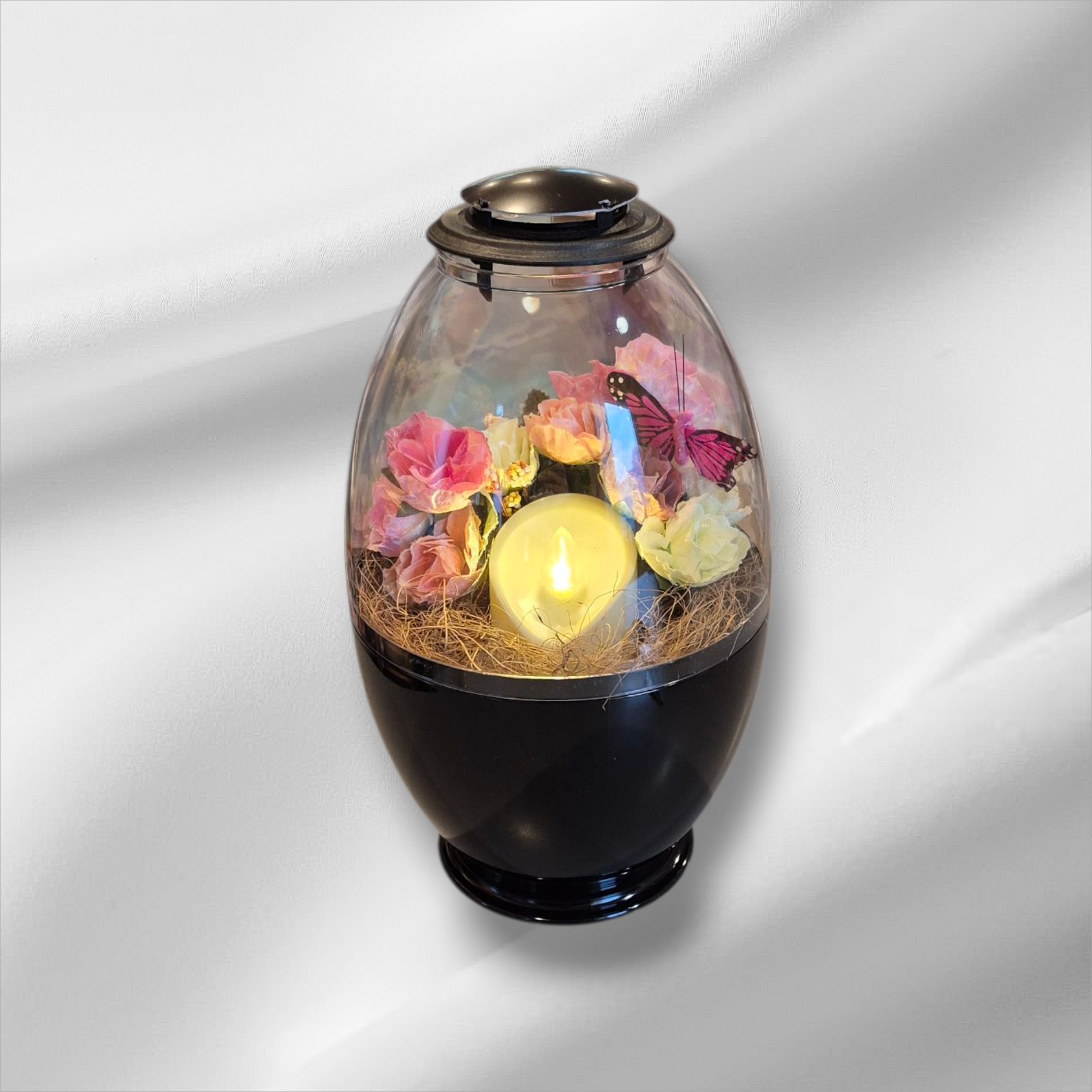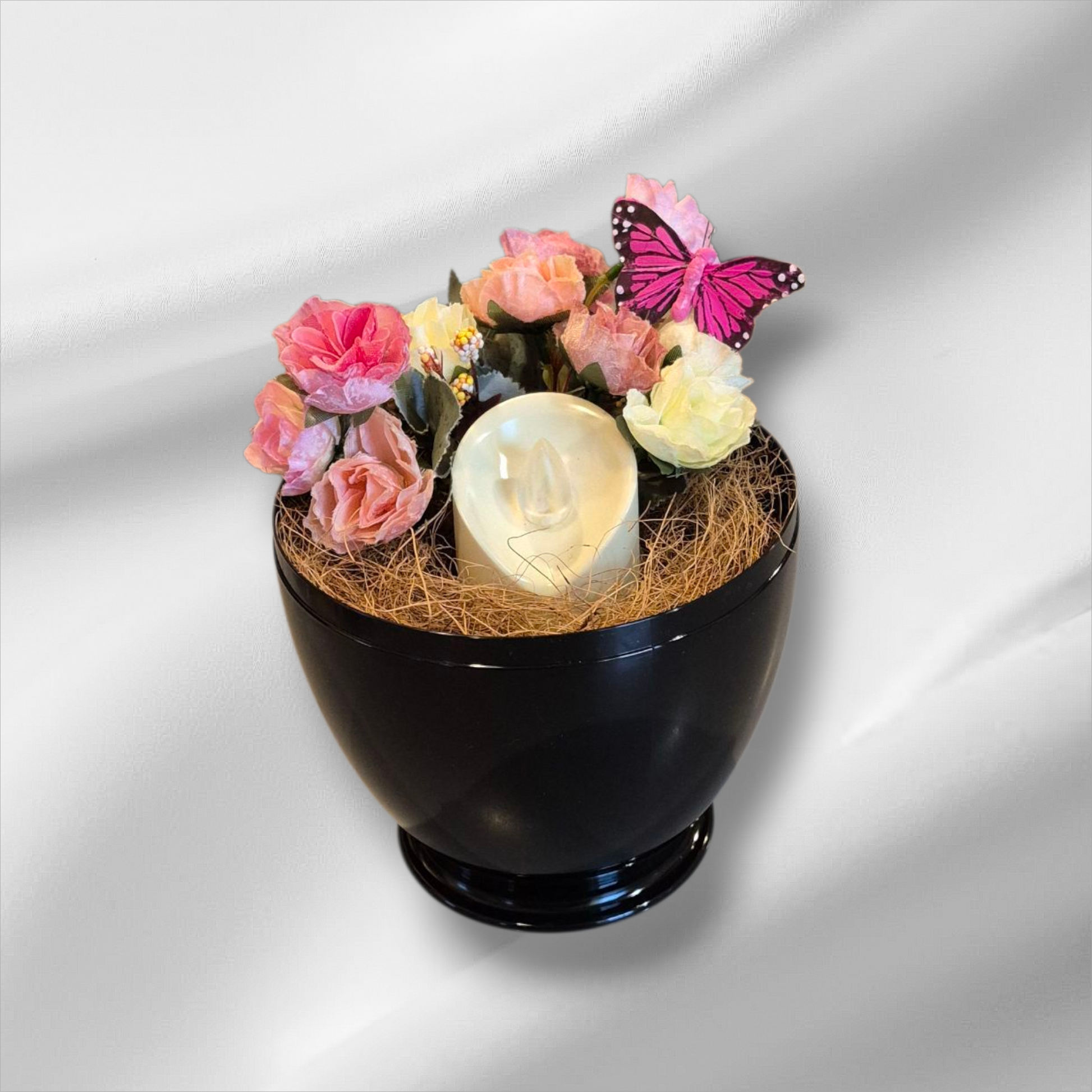 Elektronski nagrobni aranžma je izdelan iz svilnatega cvetja in vsebuje elektronski modul, ki sveti 1 leto.