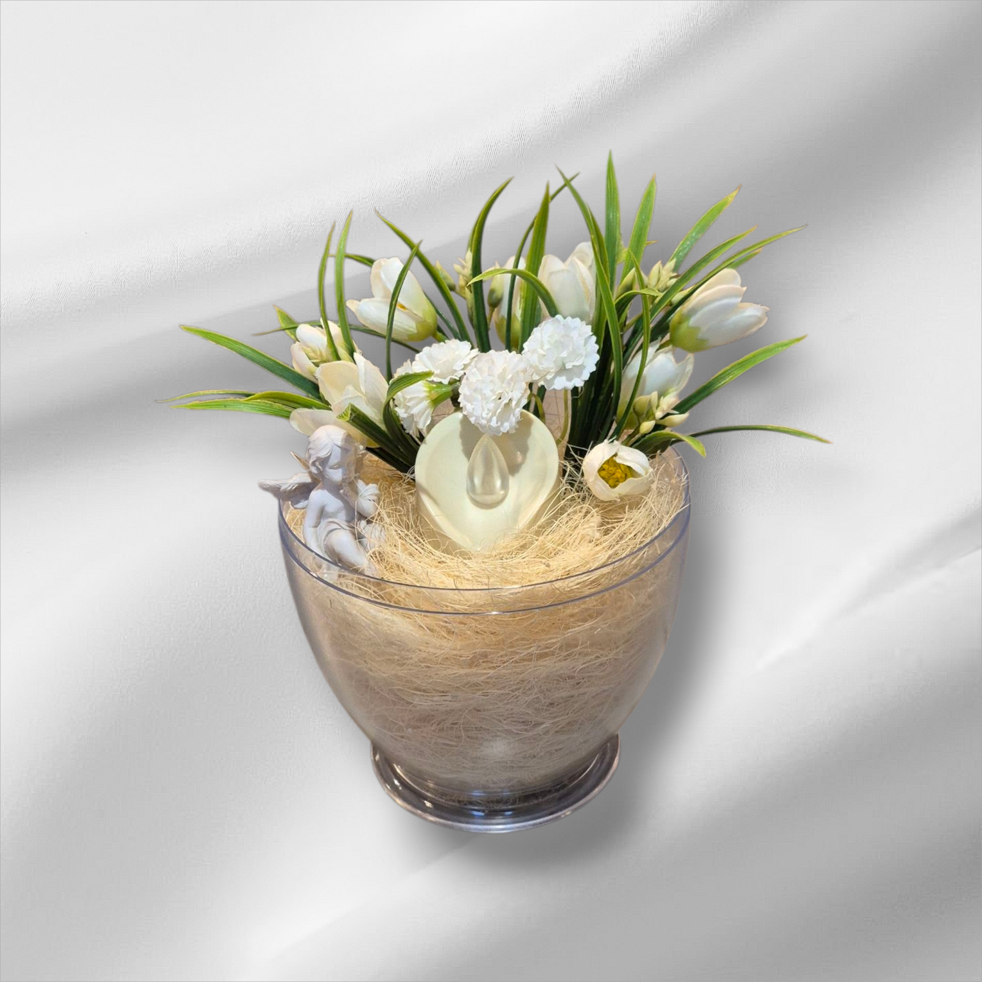 Elektronski nagrobni aranžma je izdelan iz svilnatega cvetja in vsebuje elektronski modul, ki sveti 1 leto.