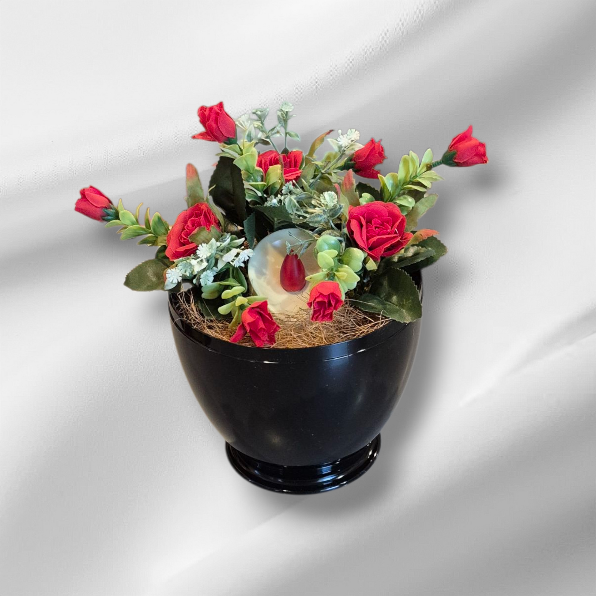 Elektronski nagrobni aranžma je izdelan iz svilnatega cvetja in vsebuje elektronski modul, ki sveti eno leto.